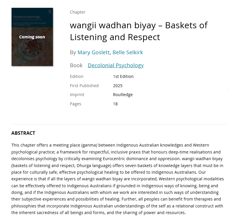 Goslett, M., & Selkirk, B. (2025). wangii wadhan biyay–Baskets of Listening and Respect. In S. Bhatia, J. S. Fernández, & C. C. Sonn (Eds). Decolonial Psychology: Academic and Activist Perspectives. Taylor & Francis Group.