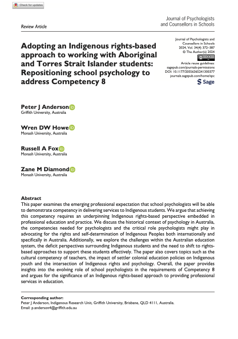 This paper examines the emerging professional expectation that school psychologists will be able to demonstrate competency in delivering services to Indigenous students. We argue that achieving this competency requires an underpinning Indigenous rights-based perspective embedded in professional education and practice. We discuss the historical context of psychology in Australia, the competencies needed for psychologists and […]